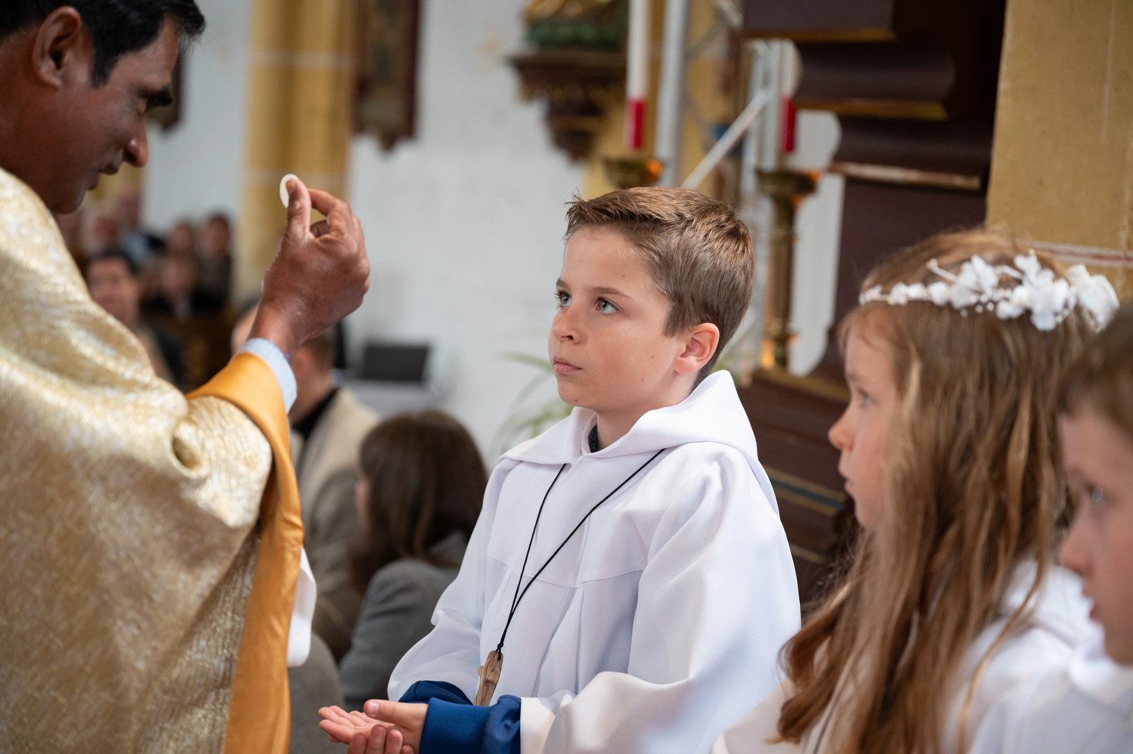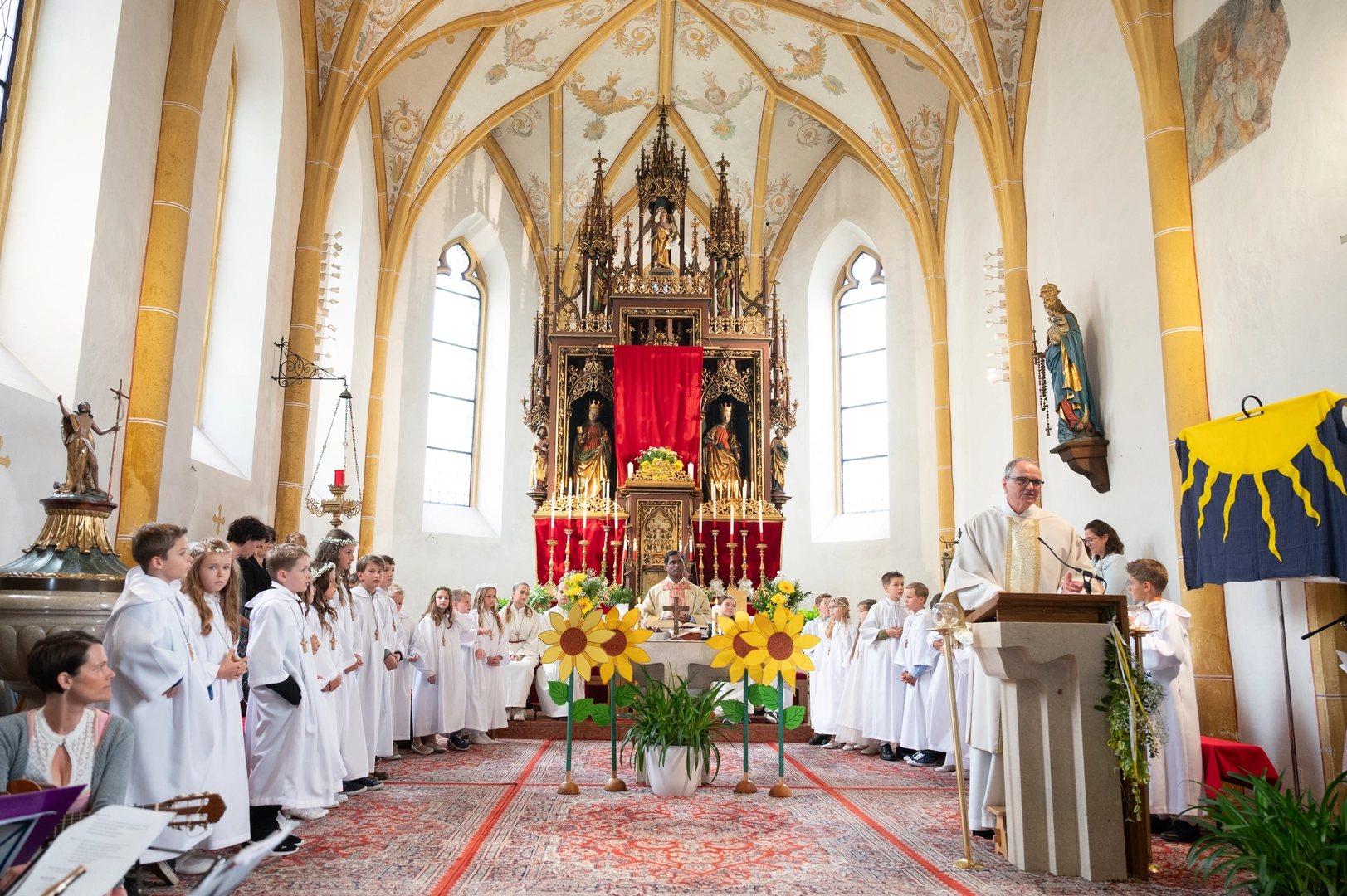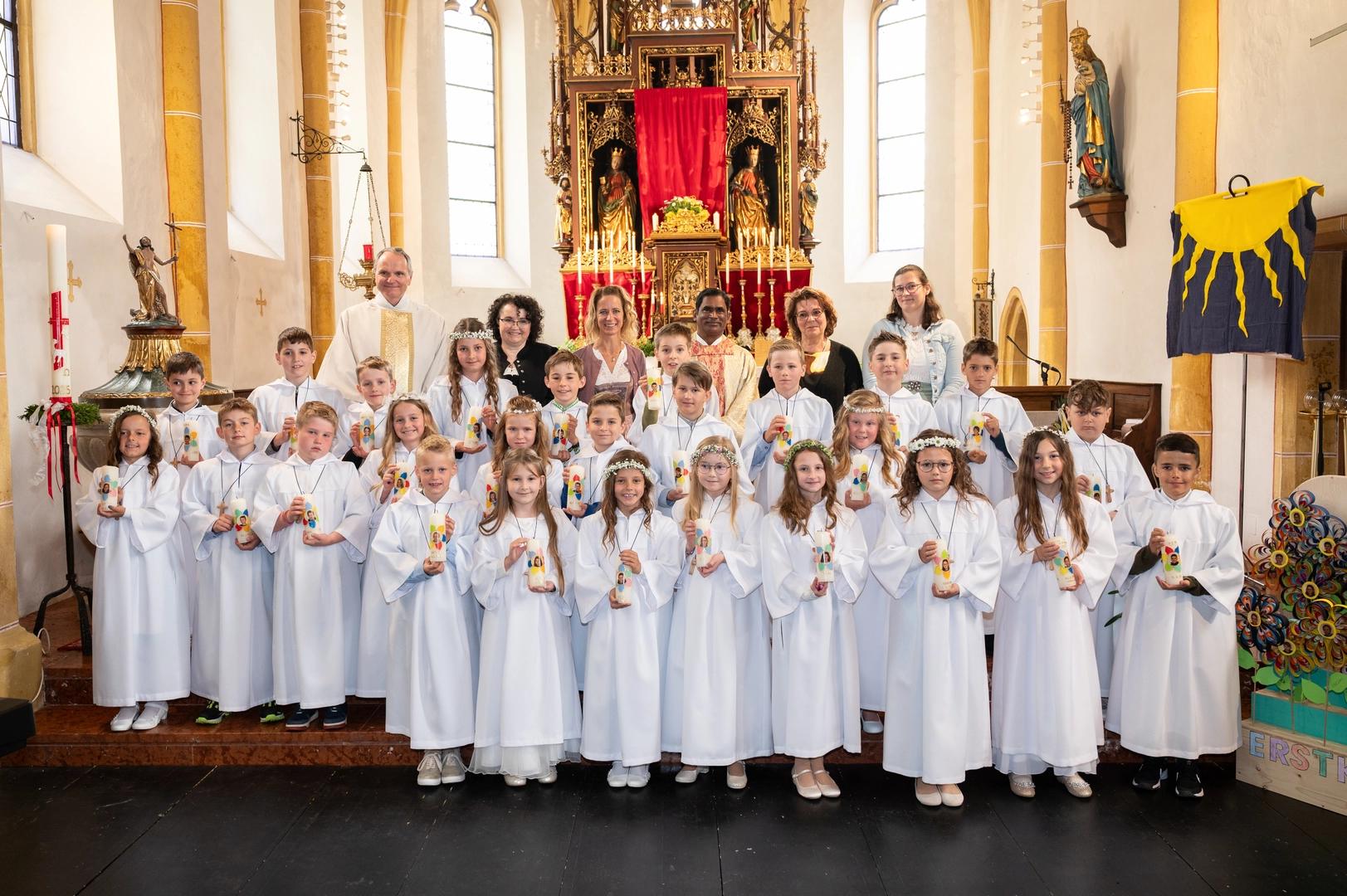 Gemeinsam mit ihren Familien, Pfarrer Ananda Reddy Gopu und Diakon Josef Wedenig haben die Erstkommunionkinder einen feierlichen Gottesdienst gestaltet und zum ersten Mal das Leib Christi empfangen haben.